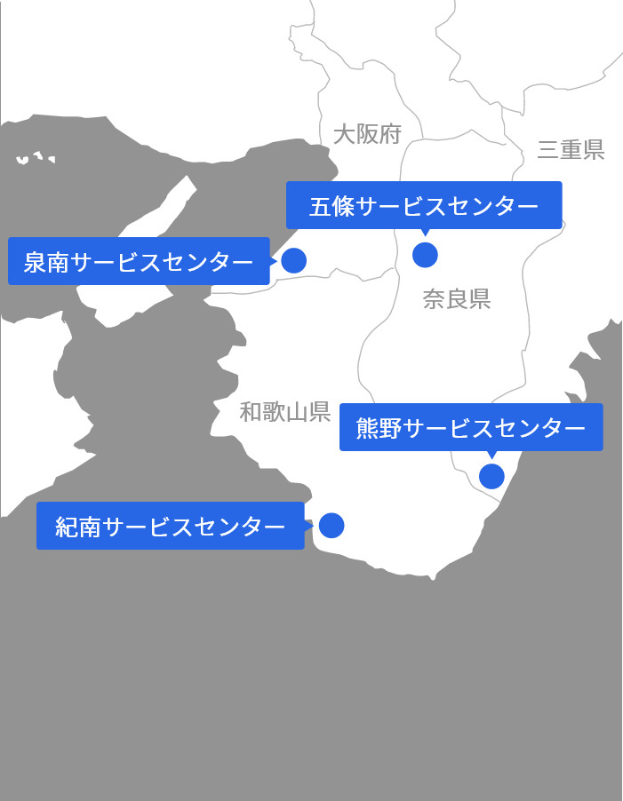 当社は南近畿全域に4つのサービスセンターが有りますので近畿エリア施工の際は、当社へお気軽にお問合せください。