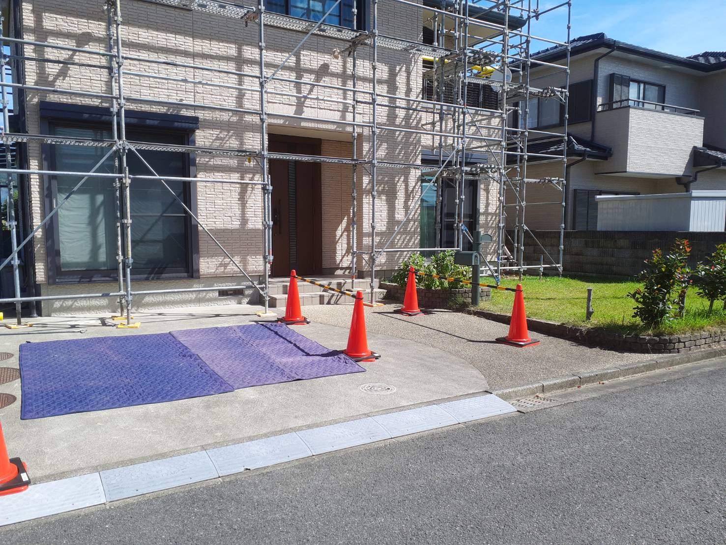 玄関前の足場を開口し、落下防止対策として巾木設置+養生シート巻き上げを行っています。