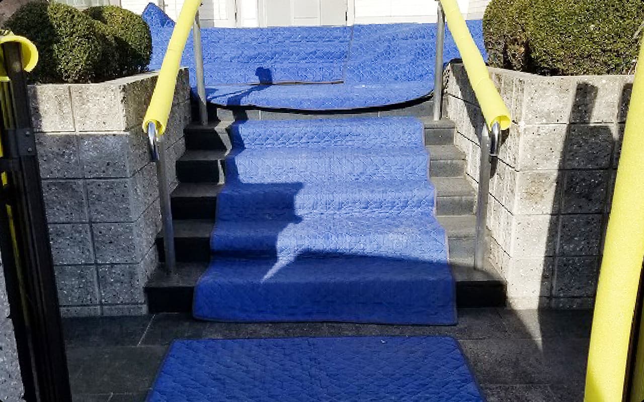 養生布を用いて建物に疵が付かないように配慮して作業を行っています。