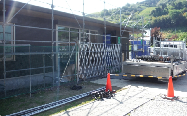 工事が完了すれば足場を解体します。解体前にお客様に報告すべきことがないか、足場に不安全な箇所がないかを確認してから解体作業を行います。またトラック停車位置には第三者災害防止措置を施すことも重要な仕事です。